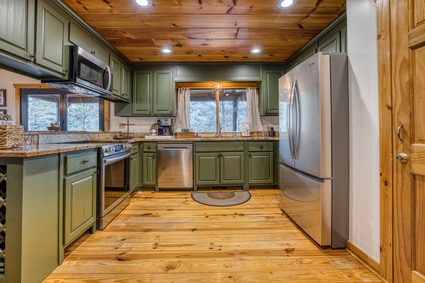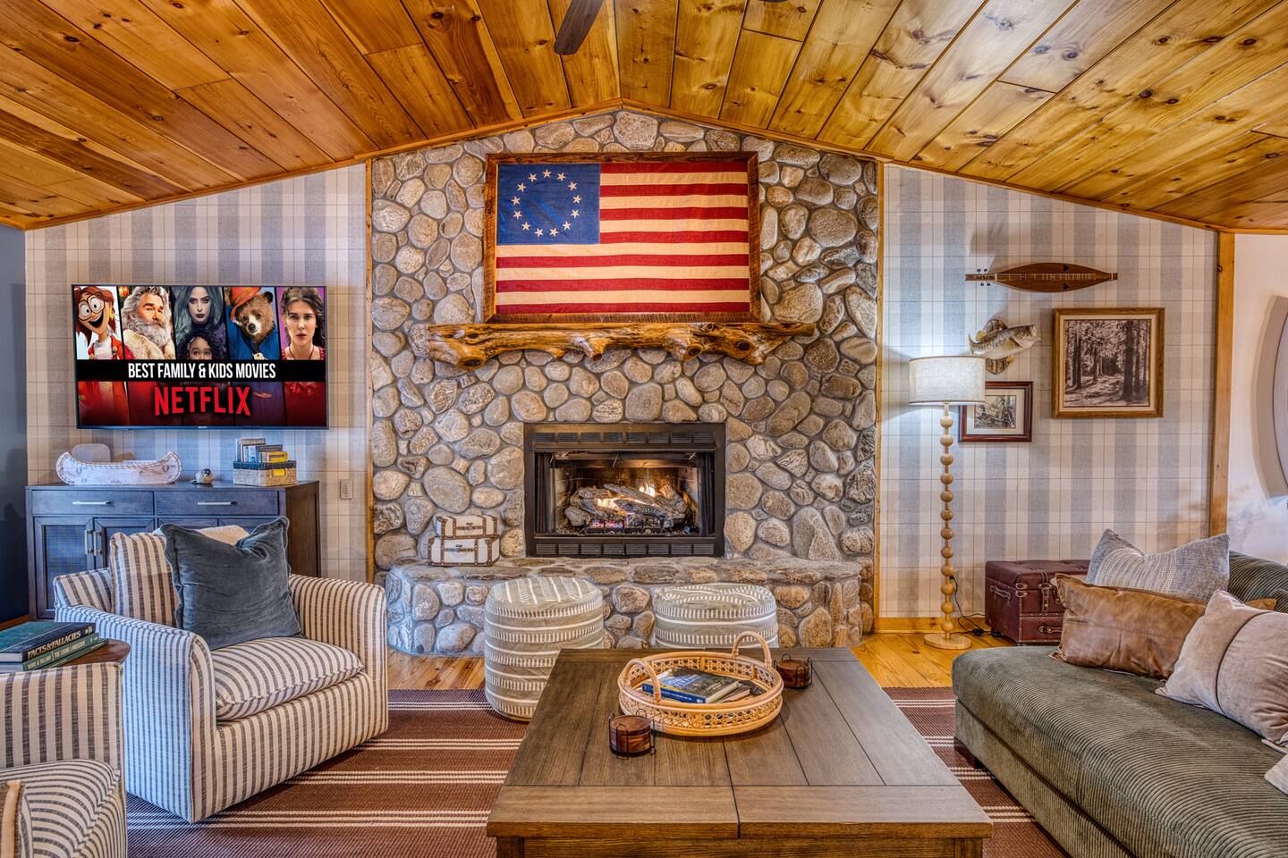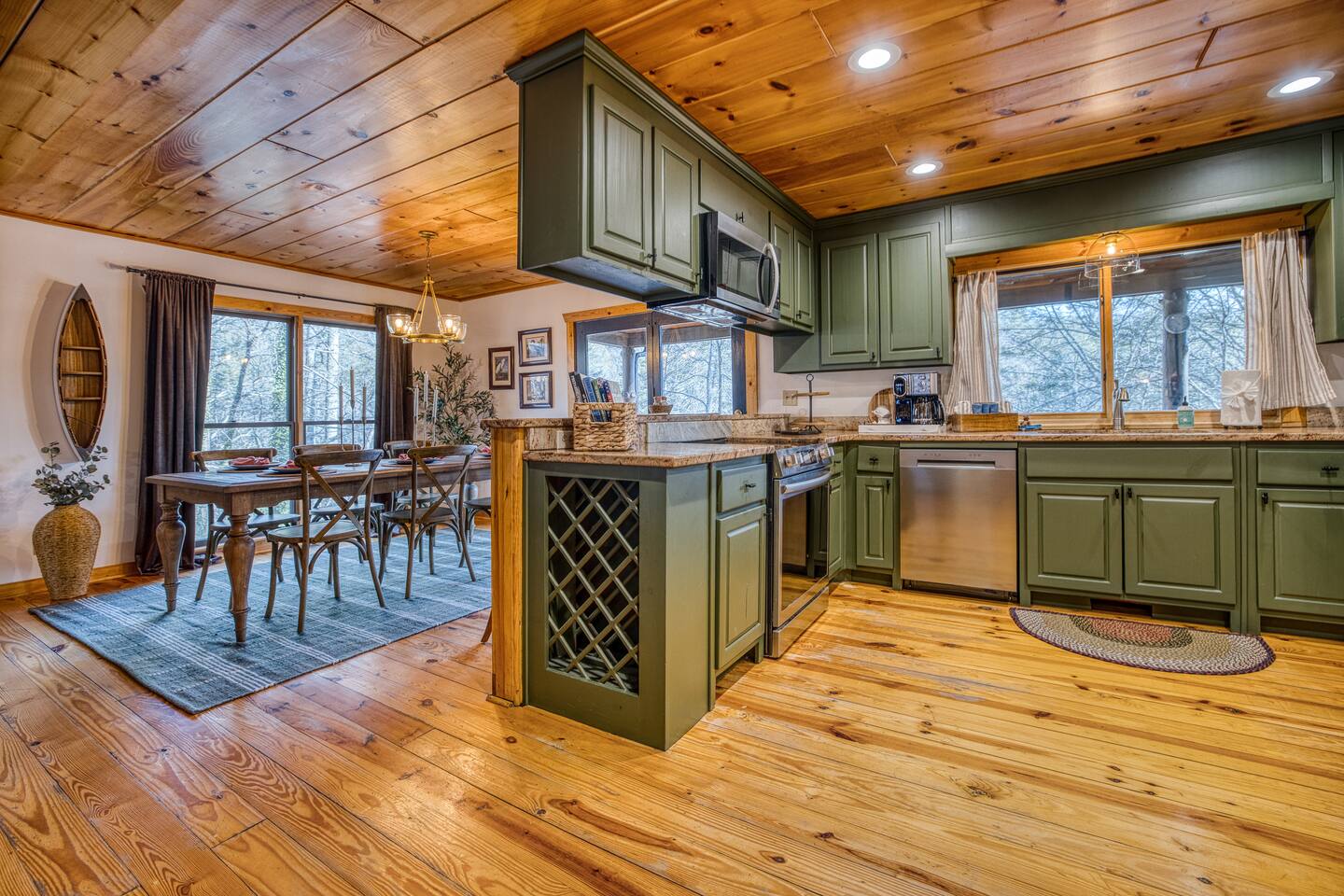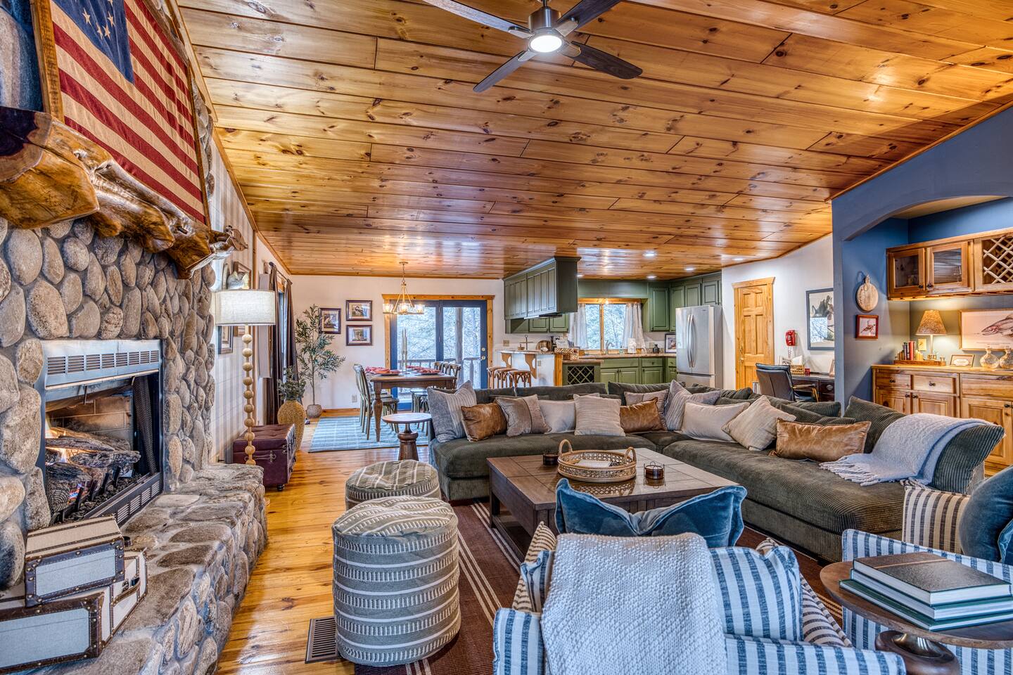 🎣 Large riverfront deck + steps down to the water 💦 Hot tub 🧖♀️ Barrel (steam) sauna 🔴 Red light sauna 🔥 Firepit 🎱 Gameroom with pool table 🎤 Karaoke ☀️ Outdoor games 🛌 4 Bedrooms + 3 bath + Bunk area + Queen sleeper sofa ☕️ Hot Cocoa/Coffee Bar 📡 High speed Starlink WiFi 🍗 Large outdoor BBQ grill 📺 TV in every room + outside TV 📺 Smart TVs in every room 🍳Fully stocked kitchen 🍸 Frozen drink maker 🧺 Laundry nook 🧘 yoga mats