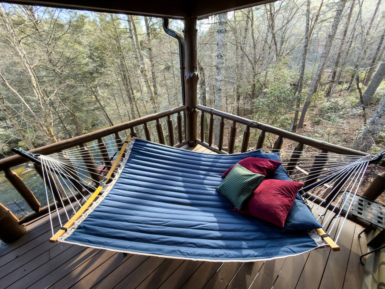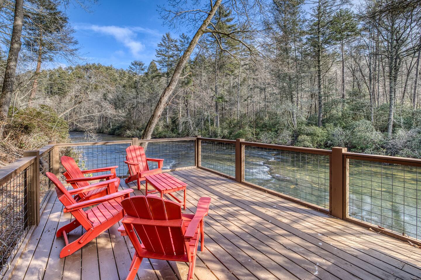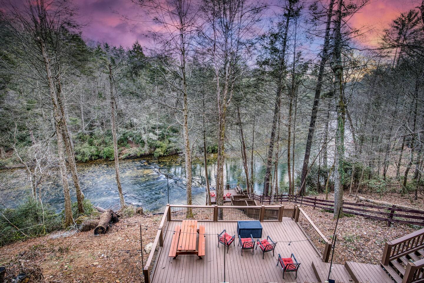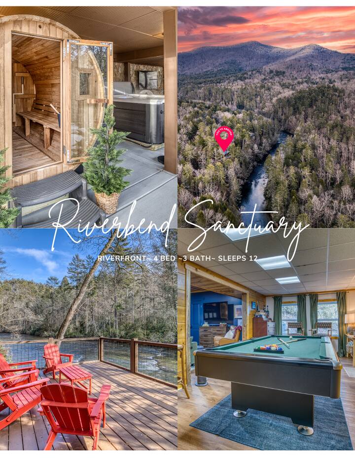 Welcome to Riverbend Sanctuary — A Luxury River Retreat 🏞️ Tucked along a private stretch of the Toccoa River headwaters, Riverbend Sanctuary is designed to be more than a place to stay—it’s a place to rest, recharge, and reconnect. Located just 11 miles from downtown Blue Ridge, this peaceful, spa-inspired retreat blends upscale comfort, nature, and wellness for families, couples, and small groups. Whether you're enjoying morning coffee overlooking the water, unwinding in the sauna, or stepping down to the river for world-class fly fishing, every detail is designed for relaxation. A Private Wellness Experience— Enjoy luxury amenities that bring the feel of a boutique retreat: 🛁 8 person hot tub with lights and jets 🧖♀️ 8 person barrel steam sauna for deep relaxation 🔴 Red light sauna in the primary suite 🔥 Firepit for quiet evenings by the river ☕ Coffee and hot cocoa bar 🥂 Wet bar 📡 High-speed Starlink WiFi 🧺 Laundry nook with new washer and dryer 📺 Smart TVs in every room Riverfront Living & Fly Fishing— The property sits directly on the Toccoa River headwaters, known for its clear water and excellent trout fishing. Guests can: 🔸Walk directly down to the river from the private deck 🔸Enjoy fly fishing, tubing, or kayaking just steps from the home 🔸Relax on the riverside deck and listen to the water flow 🔸A separate picnic deck provides the perfect setting for outdoor meals surrounded by nature. Outdoor Spaces Designed for Relaxation— The home was designed to let you slow down and enjoy the setting: 🔸Covered upstairs porch with hammock and seating around a gas firepit 🔸Downstairs covered lounge with TV, grill, cornhorn, life size outdoor games, hot tub, and sauna 🔸Large private BBQ grill for family meals outdoors 🔸 Gather around the outdoor wood burning fire pit overlooking the river. 🔸Every outdoor space is positioned to take in the sound and view of the river, creating a true retreat atmosphere. Warm, Comfortable Interior— Inside, Riverbend Sanctuary combines rustic charm with modern comfort: 🍽️Fully stocked kitchen with new appliances 🍴Dining area perfect for gathering 🛋️An inviting living room with stone fireplace 🎱Lower-level living room and game room with pool table Sleeping Arrangements— Spacious and comfortable accommodations for families or groups: 🛏️Top Floor: Primary king suite with red light sauna, plus one queen bedroom 🛏️ Lower Level: One king bedroom, one queen bedroom, bunk bed, and sleeper sofa in the lower living room 📺 All bedrooms include large Smart TVs and comfortable bedding for restful nights. Easy Arrival— 🗝️Enjoy seamless self check-in with personalized keypad entry for a smooth, stress-free start to your stay.