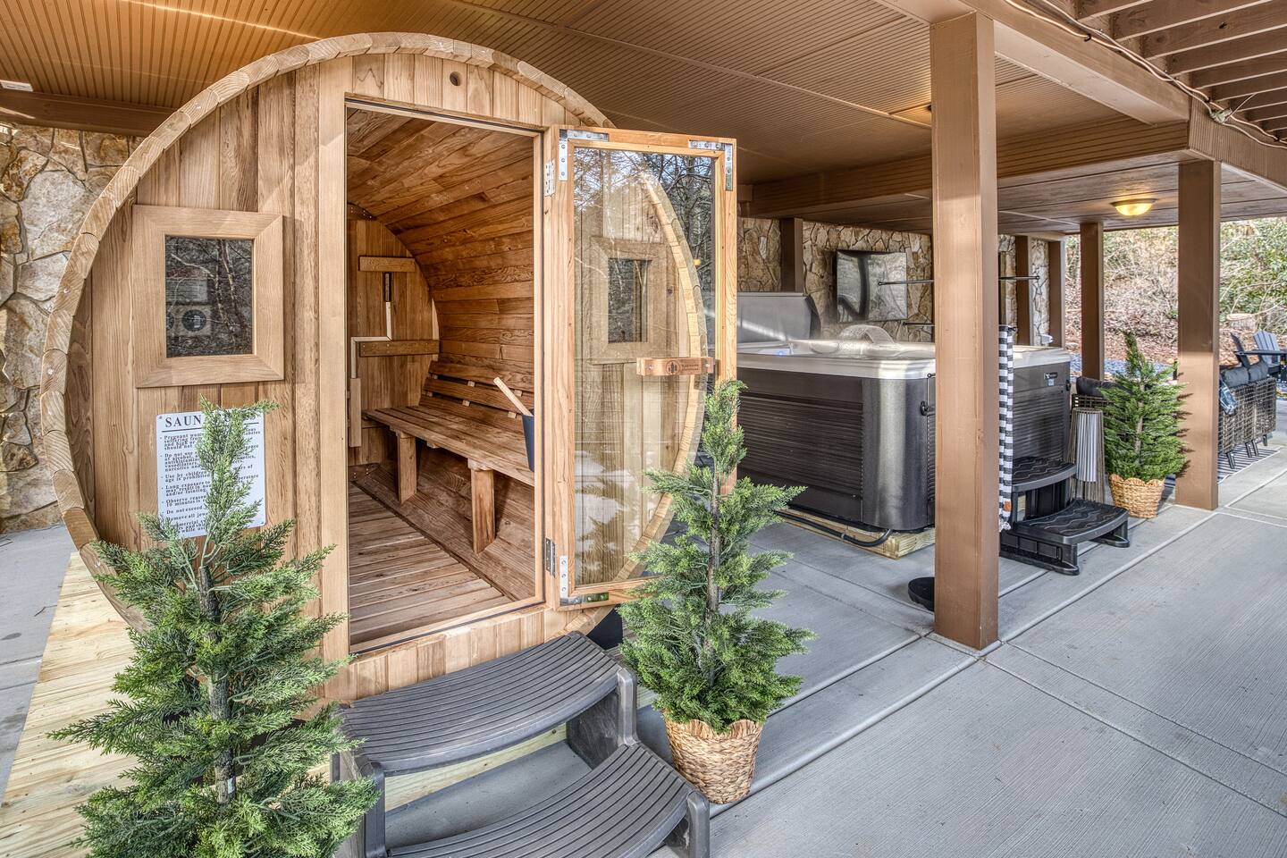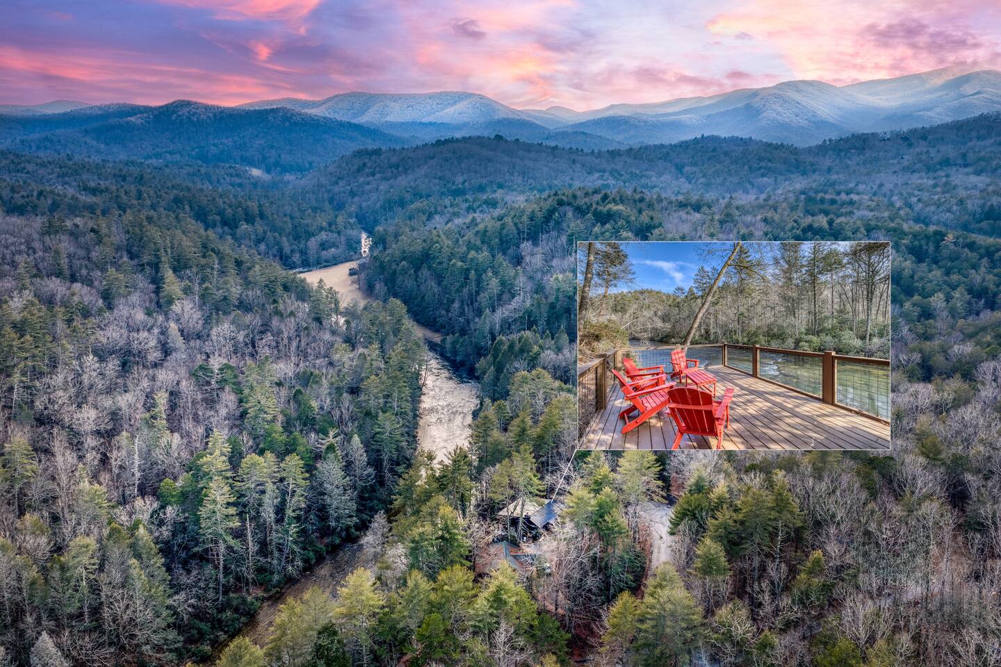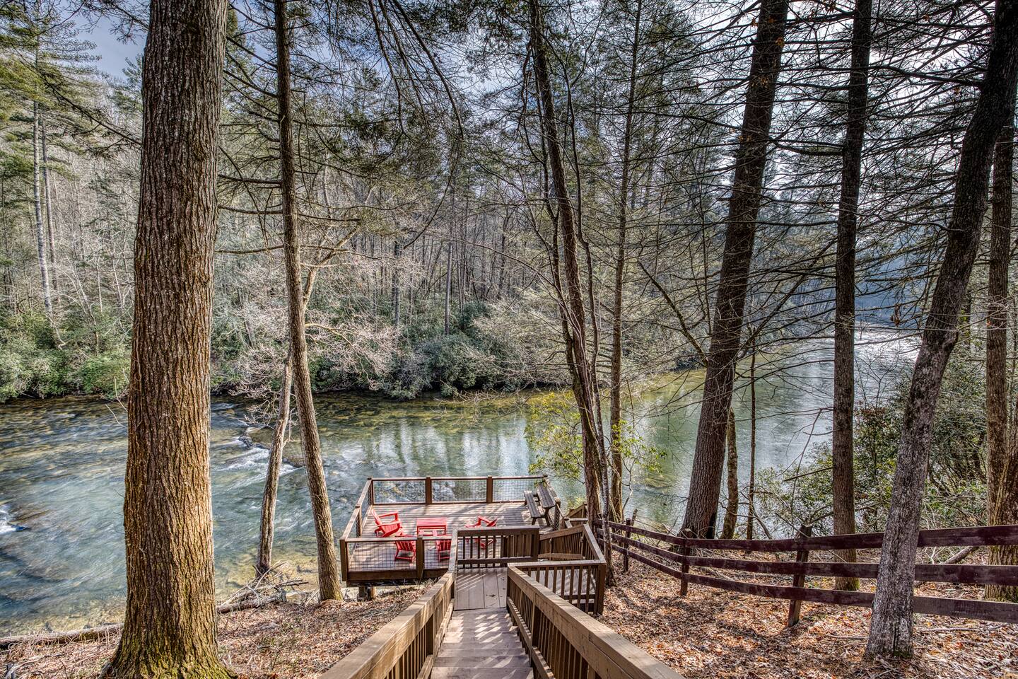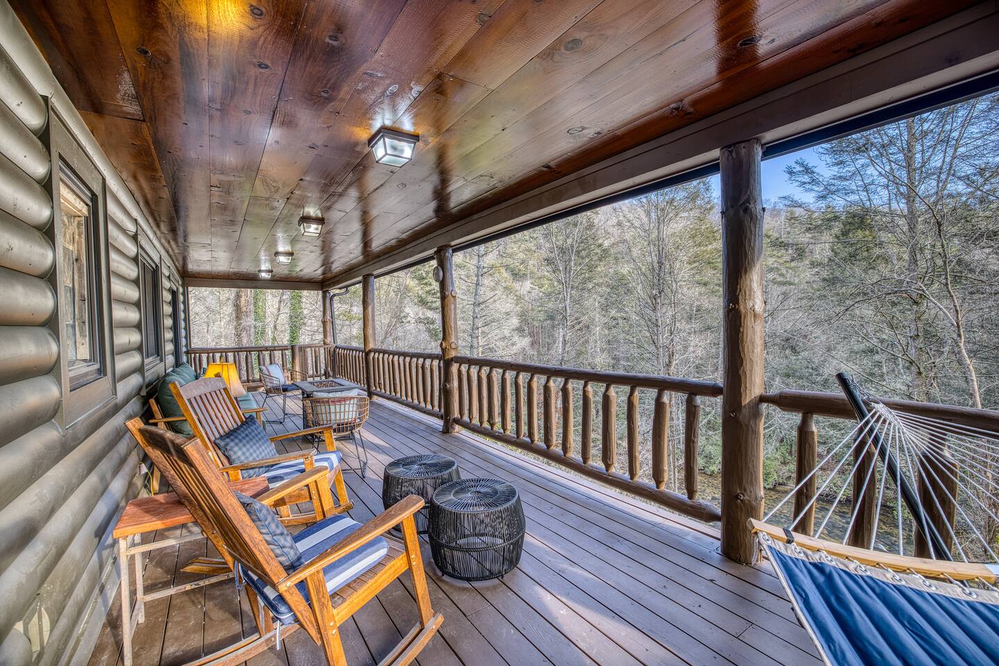 Welcome to Riverbend Sanctuary — A Luxury River Retreat 🏞️ Tucked along a private stretch of the Toccoa River headwaters, Riverbend Sanctuary is designed to be more than a place to stay—it’s a place to rest, recharge, and reconnect. Located just 11 miles from downtown Blue Ridge, this peaceful, spa-inspired retreat blends upscale comfort, nature, and wellness for families, couples, and small groups. Whether you're enjoying morning coffee overlooking the water, unwinding in the sauna, or stepping down to the river for world-class fly fishing, every detail is designed for relaxation. A Private Wellness Experience— Enjoy luxury amenities that bring the feel of a boutique retreat: 🛁 8 person hot tub with lights and jets 🧖♀️ 8 person barrel steam sauna for deep relaxation 🔴 Red light sauna in the primary suite 🔥 Firepit for quiet evenings by the river ☕ Coffee and hot cocoa bar 🥂 Wet bar 📡 High-speed Starlink WiFi 🧺 Laundry nook with new washer and dryer 📺 Smart TVs in every room Riverfront Living & Fly Fishing— The property sits directly on the Toccoa River headwaters, known for its clear water and excellent trout fishing. Guests can: 🔸Walk directly down to the river from the private deck 🔸Enjoy fly fishing, tubing, or kayaking just steps from the home 🔸Relax on the riverside deck and listen to the water flow 🔸A separate picnic deck provides the perfect setting for outdoor meals surrounded by nature. Outdoor Spaces Designed for Relaxation— The home was designed to let you slow down and enjoy the setting: 🔸Covered upstairs porch with hammock and seating around a gas firepit 🔸Downstairs covered lounge with TV, grill, cornhorn, life size outdoor games, hot tub, and sauna 🔸Large private BBQ grill for family meals outdoors 🔸 Gather around the outdoor wood burning fire pit overlooking the river. 🔸Every outdoor space is positioned to take in the sound and view of the river, creating a true retreat atmosphere. Warm, Comfortable Interior— Inside, Riverbend Sanctuary combines rustic charm with modern comfort: 🍽️Fully stocked kitchen with new appliances 🍴Dining area perfect for gathering 🛋️An inviting living room with stone fireplace 🎱Lower-level living room and game room with pool table Sleeping Arrangements— Spacious and comfortable accommodations for families or groups: 🛏️Top Floor: Primary king suite with red light sauna, plus one queen bedroom 🛏️ Lower Level: One king bedroom, one queen bedroom, bunk bed, and sleeper sofa in the lower living room 📺 All bedrooms include large Smart TVs and comfortable bedding for restful nights. Easy Arrival— 🗝️Enjoy seamless self check-in with personalized keypad entry for a smooth, stress-free start to your stay.